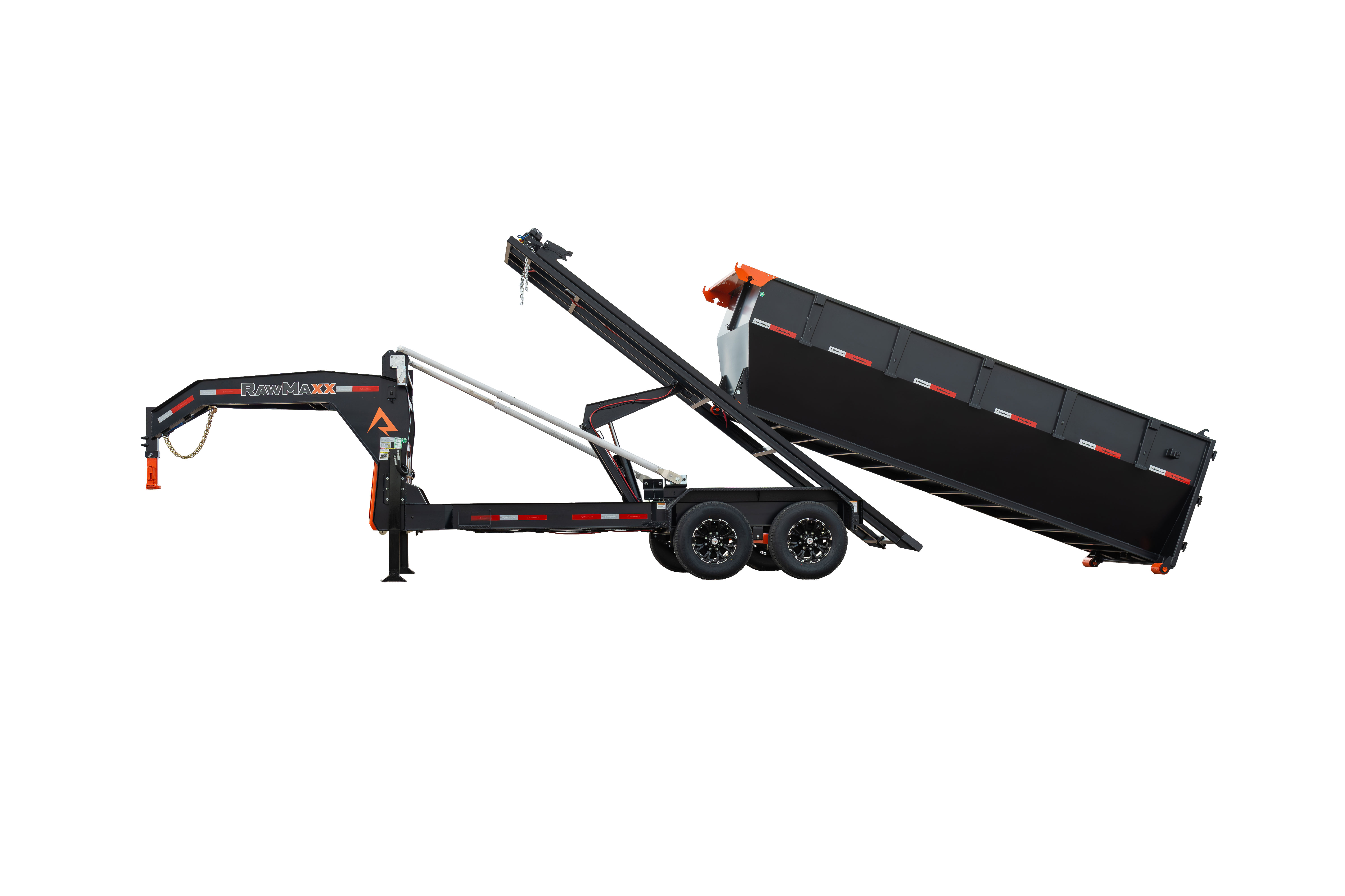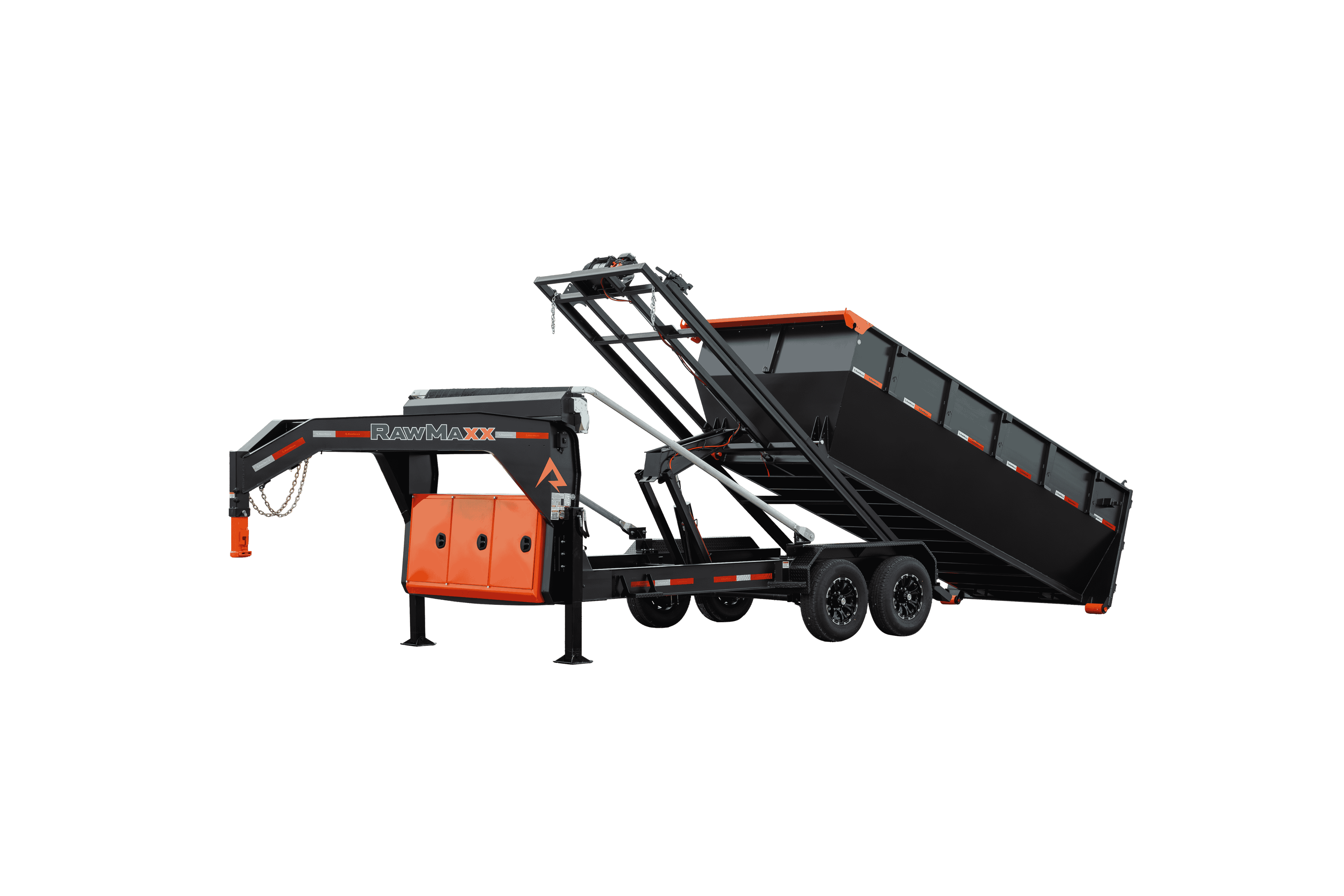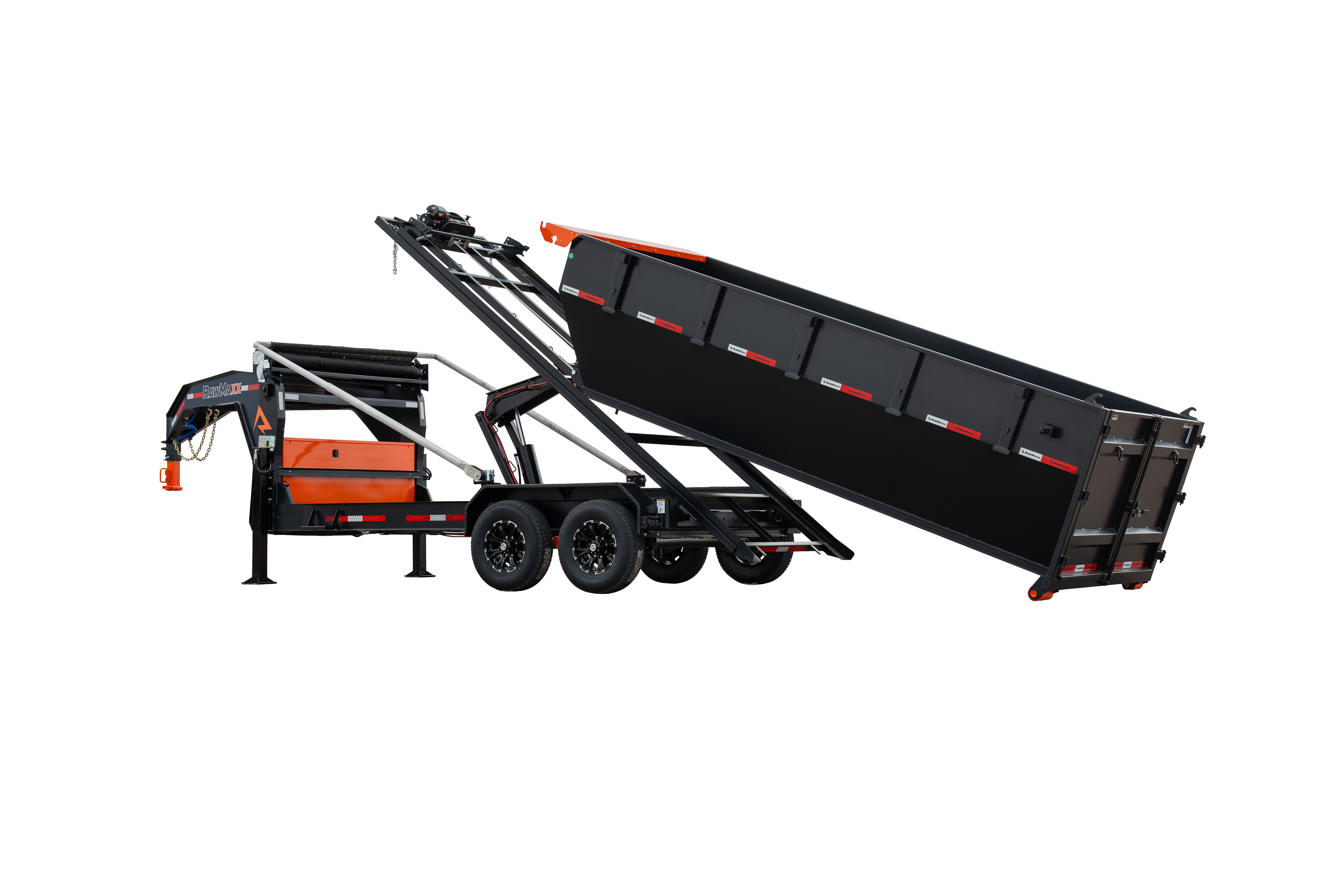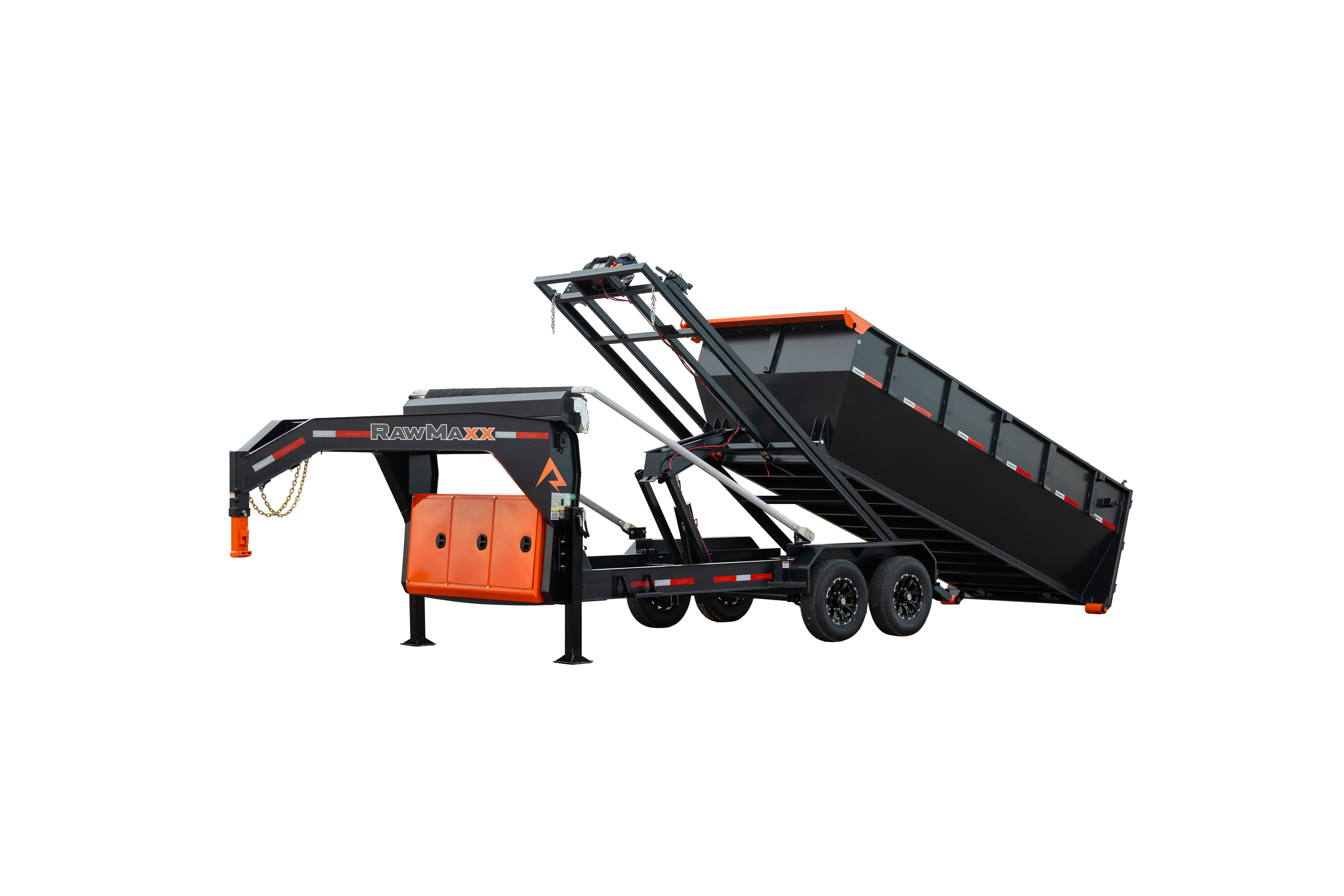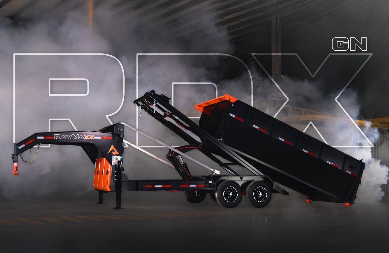 The RDX GN is a heavy-duty gooseneck trailer that comes in three sizes: 14′ x 83″, 16′ x 83″, and 20′ x 83″. The trailer features a 2-5/16” gooseneck ball coupler, 2 side wind drop legs, and a tool box for pump, battery, and charger storage. The frame is made of 10″ x 12 lb. I-beam, and the deck is 5″ x 3″ formed slide rails. The trailer tilts at a 55-degree angle and has a hydraulic power system with a KTI 12V hydraulic pump and a 17,500 lbs. Warrior electric winch. The RDX GN comes with radial tires, 10-ply, with a size of ST235/80R16 and a rating of 3,520 lbs. The trailer has DOT-approved LED lights and 3M reflective tape for safety, as well as a 27M deep cycle marine battery and a 110V integrated trickle charger for power. The RDX also offers the Roll-Off Bin and the Roll-Off Flat Bed, making it an ideal trailer for various construction jobs. Available options include a tarp kit, dual 10K hydraulic operated jacks, a KTI wireless remote, and a spare tire.