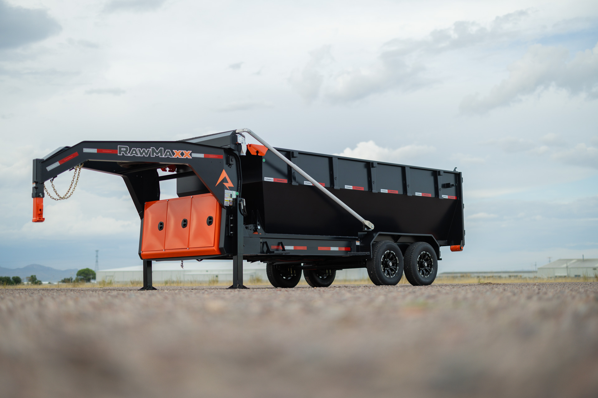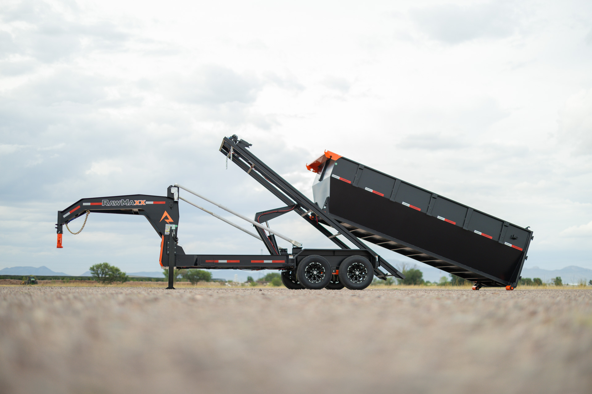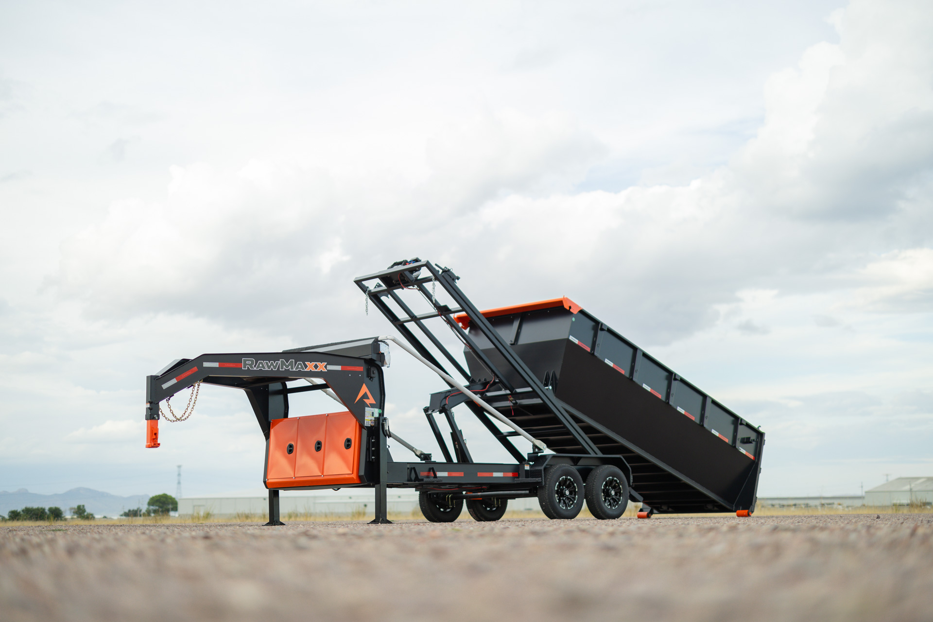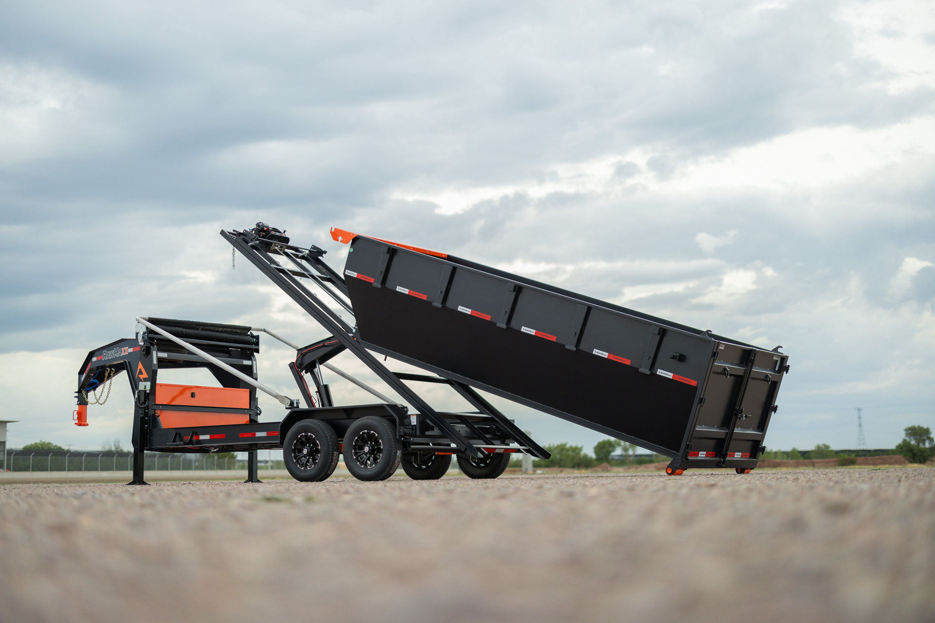 The RDX GN is a heavy-duty gooseneck trailer that comes in three sizes: 14′ x 83″, 16′ x 83″, and 20′ x 83″. The trailer features a 2-5/16” gooseneck ball coupler, 2 side wind drop legs, and a tool box for pump, battery, and charger storage. The frame is made of 10″ x 12 lb. I-beam, and the deck is 5″ x 3″ formed slide rails. The trailer tilts at a 55-degree angle and has a hydraulic power system with a KTI 12V hydraulic pump and a 17,500 lbs. Warrior electric winch. The RDX GN comes with radial tires, 10-ply, with a size of ST235/80R16 and a rating of 3,520 lbs. The trailer has DOT-approved LED lights and 3M reflective tape for safety, as well as a 27M deep cycle marine battery and a 110V integrated trickle charger for power. The RDX also offers the Roll-Off Bin and the Roll-Off Flat Bed, making it an ideal trailer for various construction jobs. Available options include a tarp kit, dual 10K hydraulic operated jacks, a KTI wireless remote, and a spare tire.